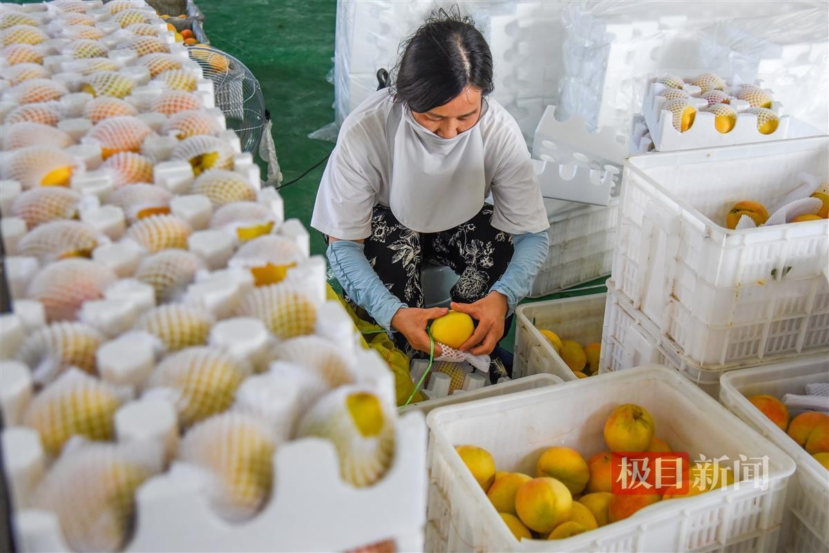 桃农在三湖黄桃基地分拣黄桃,并现场给网络下单客户发运快递(极目新闻记者 黄志刚 摄)