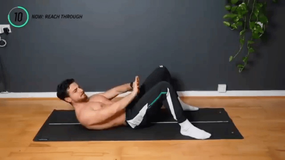 "Reach through" 是一种常见的核心肌群训练动作。这个练习主要用于锻炼腹部、腰部和背部的肌肉,特别是腹直肌(Rectus abdominis)和斜方肌(Obliques)。它可以在没有器械的情况下进行,只需一个舒适的锻炼垫或地板。