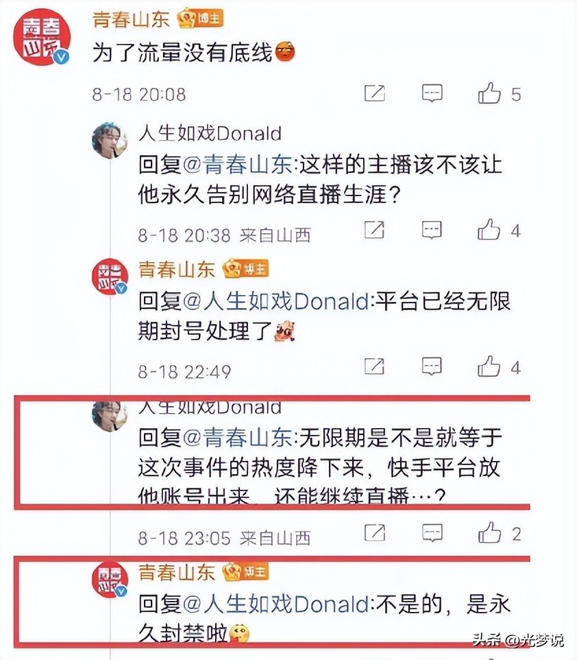 直到“青春山东”这个账号出面表示:不是的,是永久封禁了!
