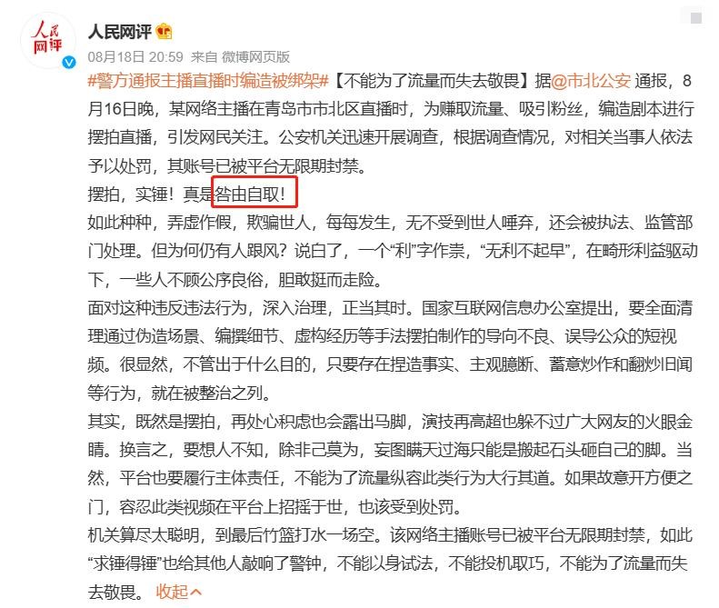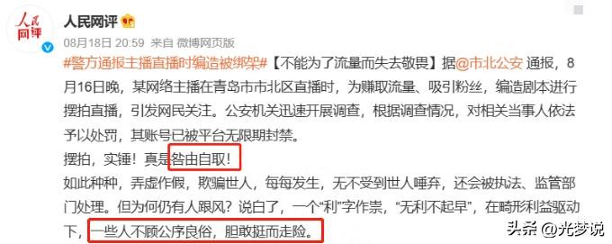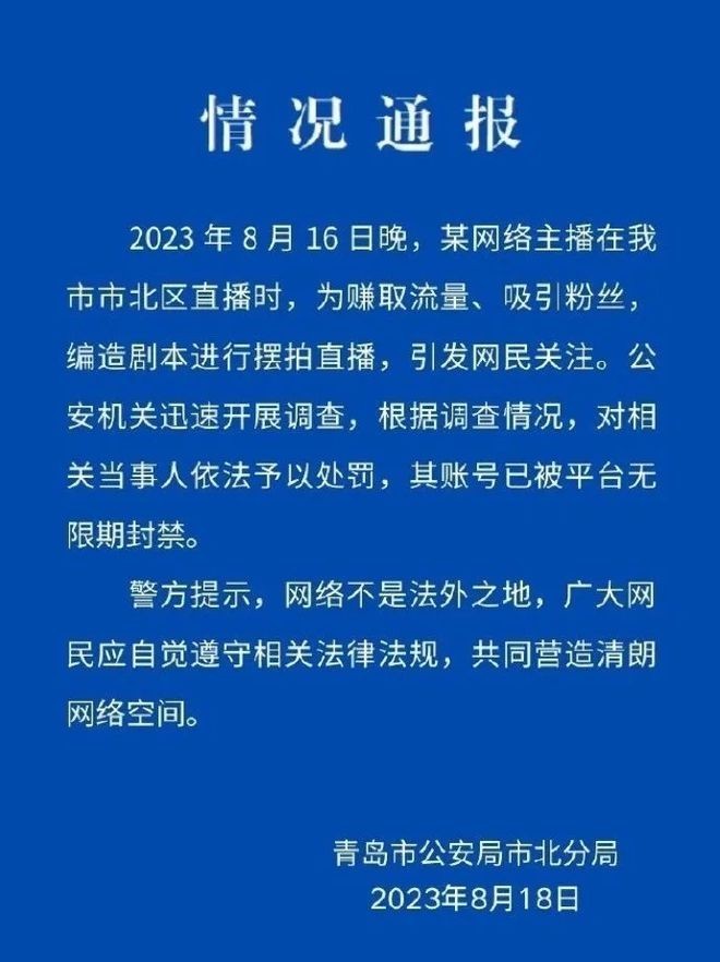 据青岛警方称:某网络主播为吸引粉丝,赚取流量,而编造剧本,进行摆拍,从而造成了不好的影响,已经对相关当事人依法处罚。