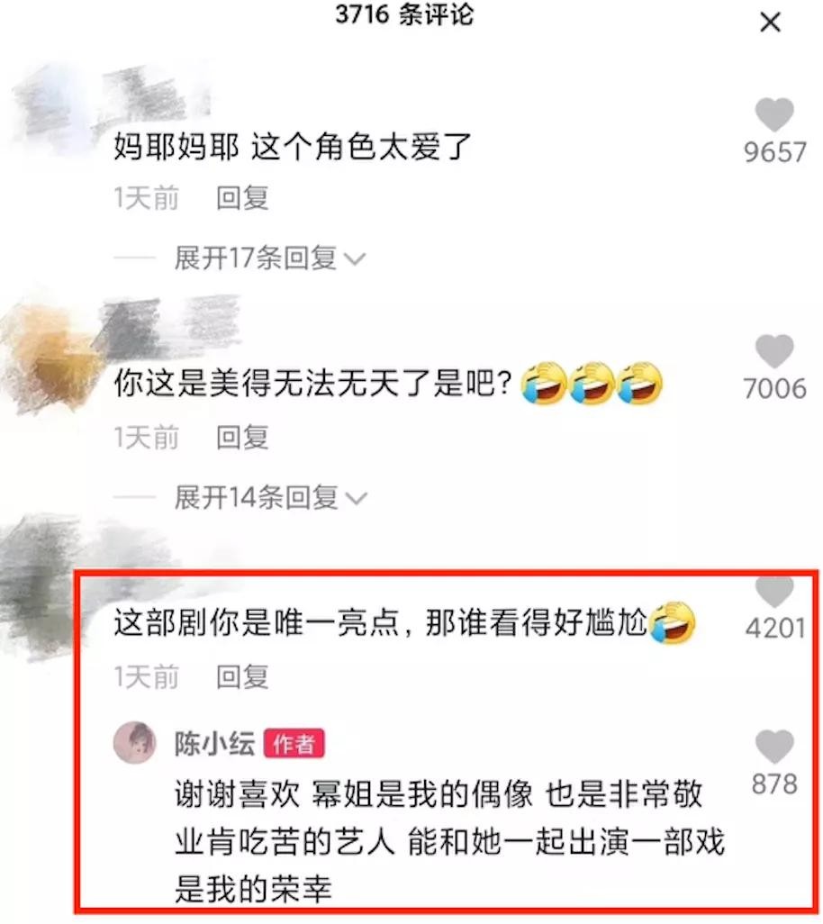 其中有一条评论说“这部剧你是唯一亮点,那谁看得好尴尬”,陈小纭回复:谢谢喜欢,幂姐是我的偶像,也是非常敬业肯吃苦的艺人,能和她一起出演一部戏是我的荣幸。