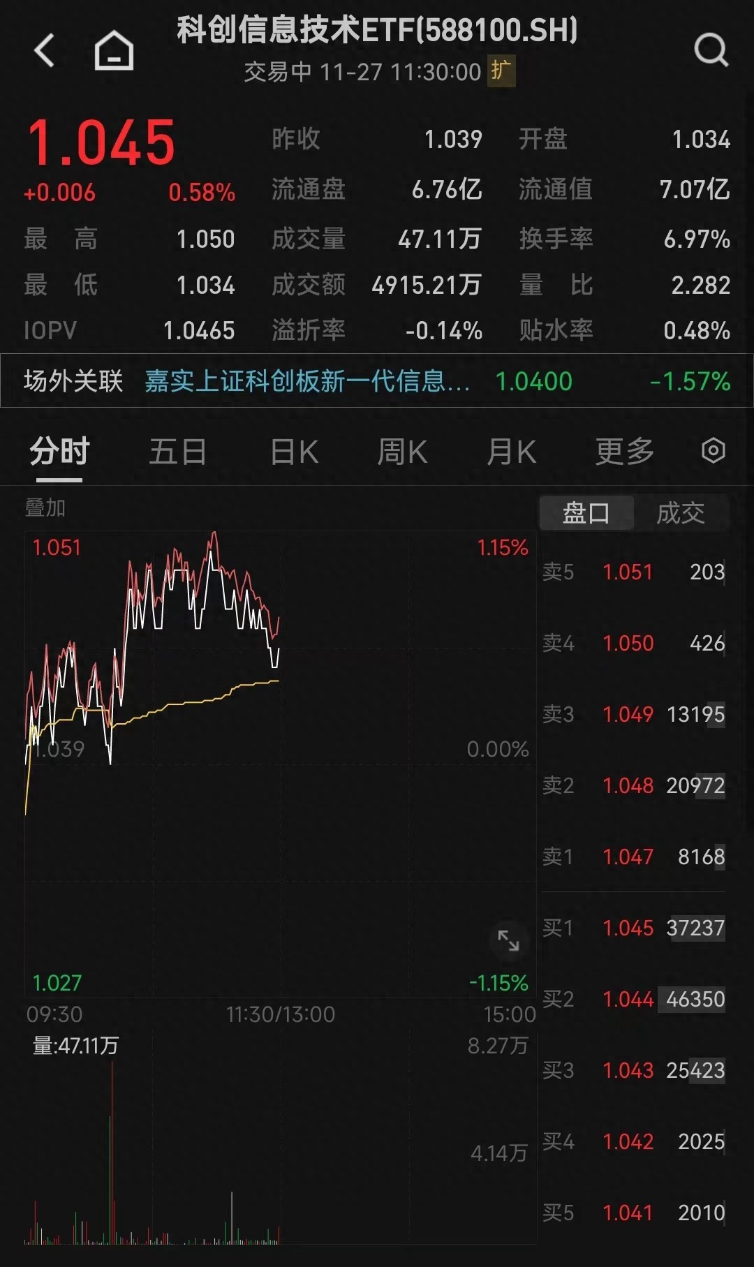 截至午间收盘,科创信息技术ETF(588100)涨0.58%;重仓股中微公司涨2.76%、沪硅产业涨1.59%、寒武纪涨0.75%。