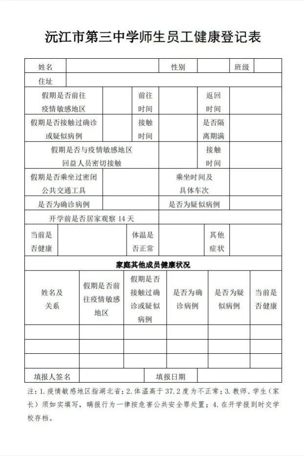 师生员工健康登记表