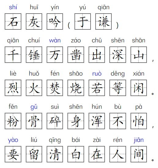 • 石灰吟:赞颂石灰。吟:吟颂,指古代诗歌体裁的一种名称。