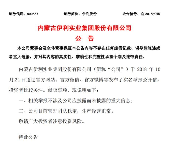 晚间,伊利股份发布公告,称其公司于2018年10月24日通过官方网站、官方微信、官方微博等发布了实名举报公开信。就该事项,伊利股份表示,相关举报不涉及公司应披露而未披露的重大信息;另外公司目前管理团队稳定,生产经营正常。并提醒广大投资者注意投资风险。