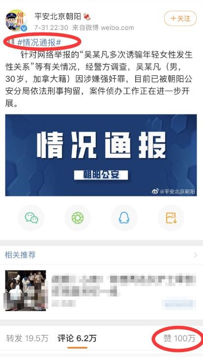 目前吴亦凡被刑拘发布以后,短短10分钟的时间点赞数就超过了100万次,可以说和吴亦凡爆红时期的成绩非常吻合,对得住他曾经顶流的身份了。