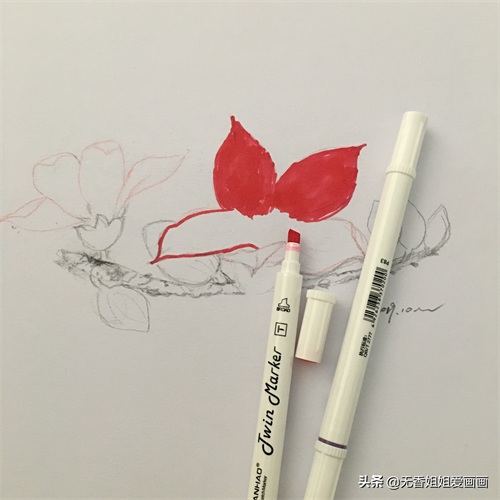 1/用自动铅笔起稿,确定花朵和枝干位置。用红色的马克笔小头轻轻地涂抹花朵。涂抹时速度要快哦,不宜同一位置多次涂抹,注意要垂直排线涂抹,不要超出边缘线。