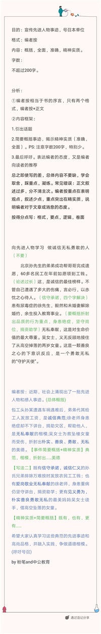 总之即使写的差,总体内容不要缺,学会取舍,踩重点,凝练。常见错误:正文叙述过多,分不清主次。编者按重点在表明观点,叙述少点,重点突出在精实质,说明编者对于文章或消息的态度。