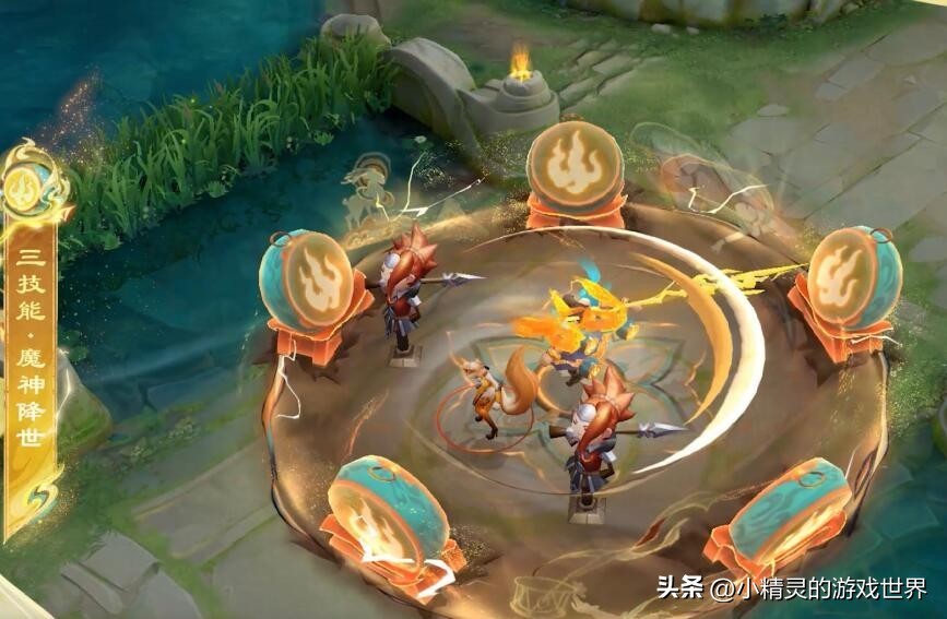 三技能·魔神降世。吕布在释放三技能的时候,目标处会先出现莲花状的图腾,随后吕布伴随金色的闪电跳向目标处,大招范围的最外圈会出现五只神鼓,闪电也会连接五只神鼓,而在神鼓之间也会出现敦煌壁画,其中还隐藏了三个小彩蛋,分别是:杨玉环的遇见飞天、貂蝉的遇见胡旋和瑶的遇见神鹿,都在壁画之中。