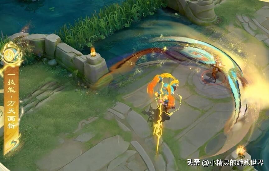 一技能·方天画斩。吕布在释放一技能的时候,会召唤出神鼓,随后方天画戟会向前挥砍,并附带金色的闪电效果,而轨迹上还会浮现出3D静态的敦煌壁画,非常的好看。