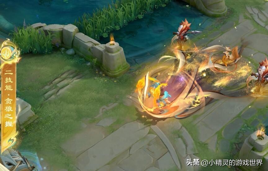 二技能·贪狼之握。吕布在释放二技能的时候,会从目标处吸取金沙流转的敦煌彩绘,吸取的彩绘都会汇集到吕布身后的神鼓上面,最终形成一个金色的护盾。