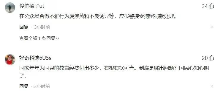 视频曝光后,网友们纷纷发表了自己的看法和观点。有人表示,大学生的行为应该检点,公共场所要注意自己的形象,不能在公共场合进行不雅行为,这不仅影响了自己的形象,也破坏了公共秩序。有人认为,这是情侣间的私事,不应该被放大,每个人都有自己的生活方式和选择,只要不违反法律,别人无权干涉。还有人表示,这只是个别现象,不能代表整个大学生群体,不能因此对大学生进行一概而论的批评。