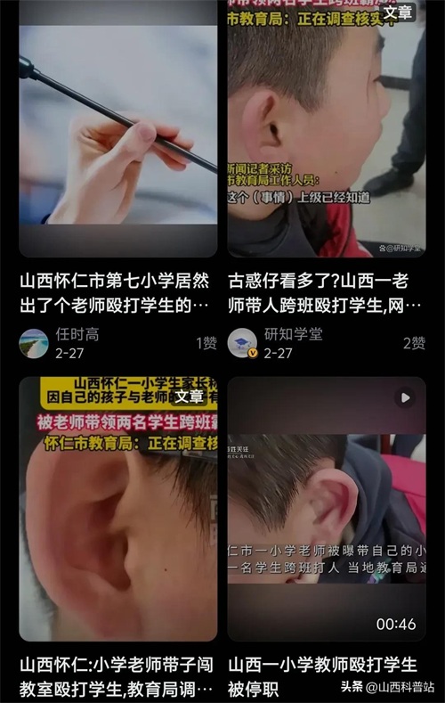 这都真事,一点不带添油加醋的。下面我们在讲讲老师打人事件,为什么现在大同人称怀仁学校是大同人的园区。那在怀仁上过学的再清楚不过。刚去峪宏的时候,真的有害怕到。那老师打人的场面不是极个别发生的事,是常态化。我们平时上课写作业那真的是如坐针毡。真的是怕的不行。可能你就写错一个拼音,可能你就是没有背诵会一段课文,可能就是你某道题不会,可能你就走了一个神。迎接你的,是桌腿的洗礼。那是真的不把你当人的打,谁的腿上没有几道淤青,那都不能称之为怀仁学生。如果是因为学习挨打,那也算情理之中,但你要成为那极个别学生,恭喜你,你就是老师的出气筒。我们班有个同学,特别犟,反正性格有缺陷,不是老师针对他,是真的和我们同学也不合群。这个同学呢,顺其自然的成了老师的出气筒。最后为了方便拿他出气,给课桌安排在了讲台的旁边,紧紧挨着黑板。我估计黑板上的字,反光条件下,他是啥也看不清了。老师明知道他啥也看不见,还有事没事提问他一下子,那他本来学习就差,在加上黑板根本看不见,肯定就是啥也不会呗。好家伙,一不会回答,直接一脚从讲台,踹到教室最后。我估计老师这种行为就是杀鸡儆猴,提醒我们要认真听讲吧。