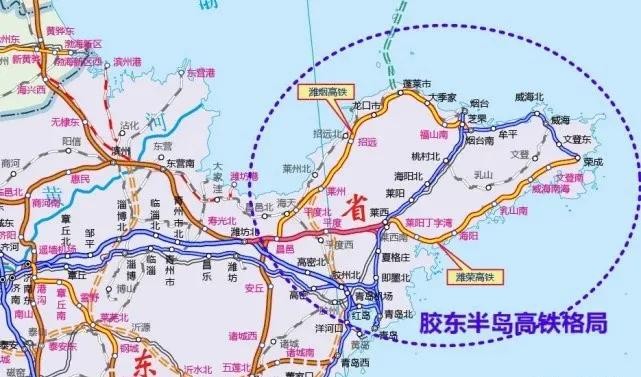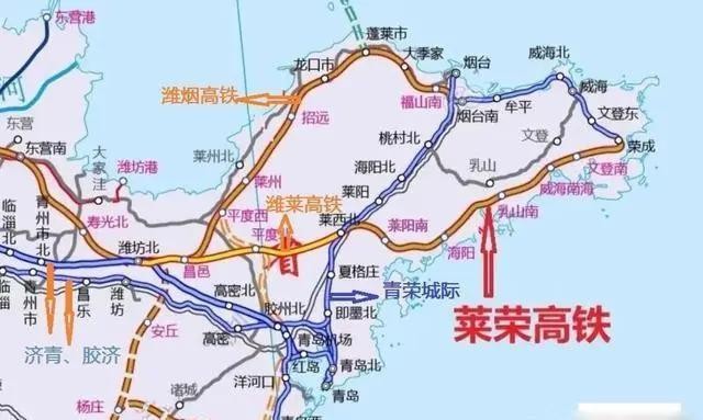 2016 年,胶东半岛的首条铁路——青烟威荣城际铁路建成并通车;2023 年,潍莱荣城际铁路实现全线贯通运营。待潍烟高铁建成通车之后,胶东半岛的主体高铁网得以构建完成,由三条横向铁路形成了一个闭环。