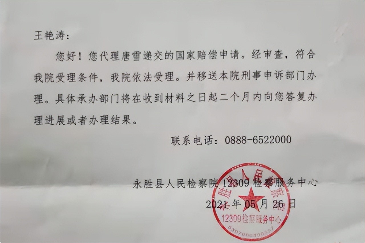 为了挽回自己丢失的名誉,唐雪亲自委托王艳涛律师向国家提出了向国家申请补偿,并且要求在第一次案件审理中的丽江检察院对当事人唐雪进行道歉。