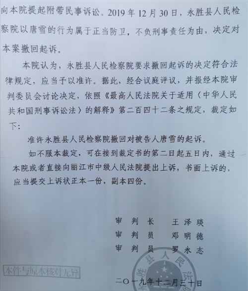 最终,在多方努力下,唐雪在第二次法院宣判时被人民法院判决唐雪的行为属于正当防卫。
