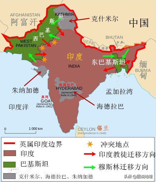 而克什米尔则不同,克什米尔是英属印度最大的土邦,且处于印巴中间,这使得无论是巴基斯坦还是印度都无法快速武力独占该地区。克什米尔的人口大部分是穆斯林,但王公是印度教徒,如果按照人口多数应该加入巴基斯坦,如果按照土邦王公决策,更倾向于加入印度。其实在最开始的时候,王公哈里·辛格大君既不想加入巴基斯坦,也不想接入印度,或许更倾向于建立独立的王国吧。王公暧昧的态度使得广大底层的穆斯林十分不满,于是爆发了穆斯林武装起义,穆斯林起义军由于装备落后并没有快速控制克什米尔,反而促使哈里·辛格彻底倒向印度。哈里·辛格迅速向印度求援,随后印度和巴基斯坦先后进入了该地区,并爆发了第一次印巴战争。