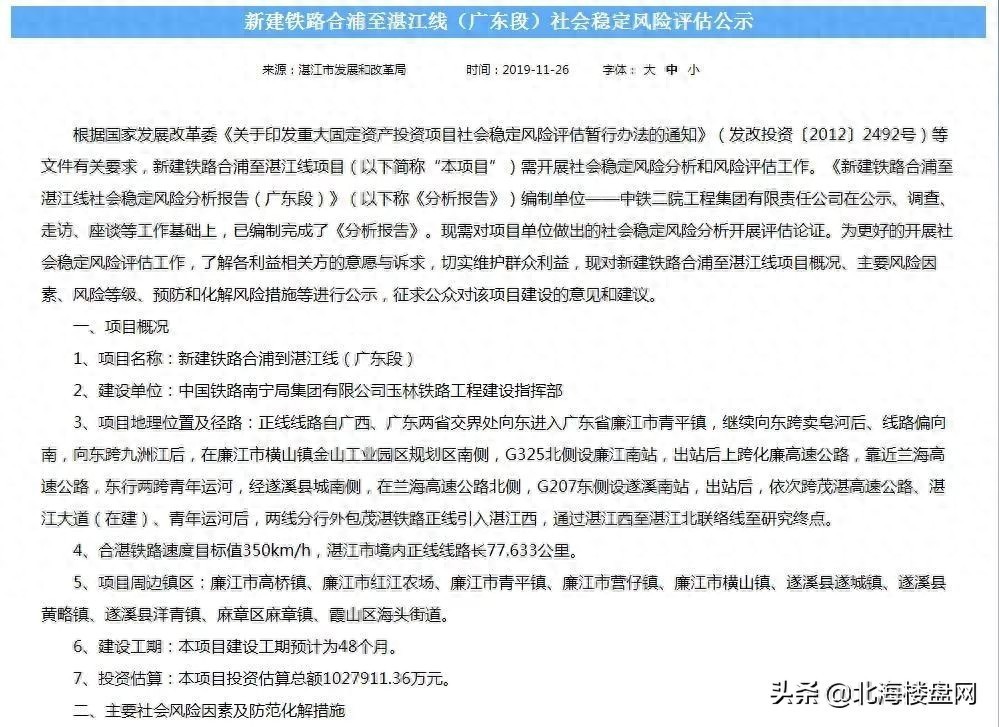 5、2019年11月26日,《新建铁路合浦至湛江线(广东段)社会稳定风险评估公示》在湛江市发展和改革局网站公布。