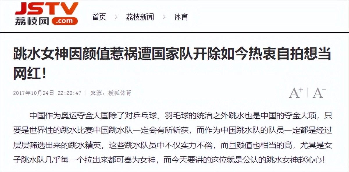 荔枝网 2017年10月24日《跳水女神因颜值惹祸遭国家队开除如今热衷自拍想当网红!》
