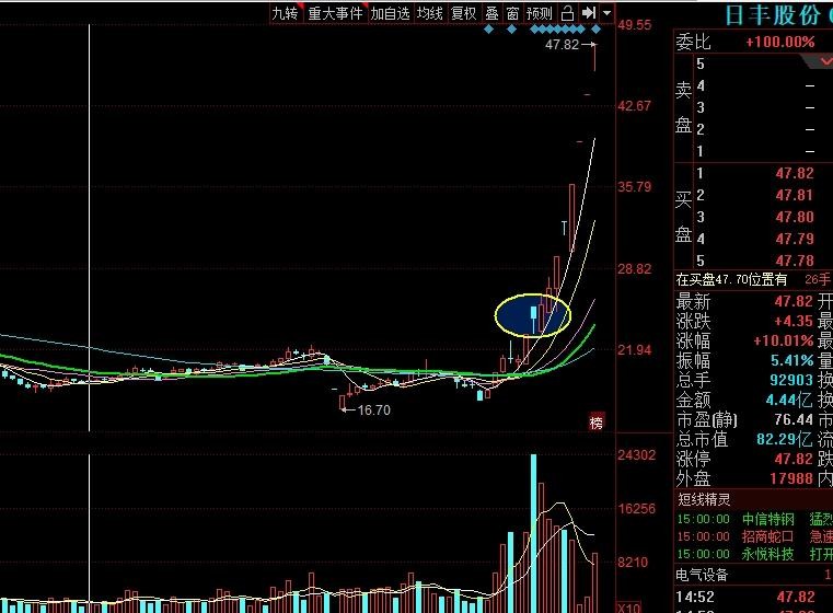 我们再来看一下日丰股份。在2020年3月11日。该股出现了苏秦背剑组合。此后该股从25块6毛8一直涨到最高47块8毛2,短线涨幅86.22%。可以说如果及时介入的话,短线获利十分巨大。这就是这一。K线组合的魅力所在!