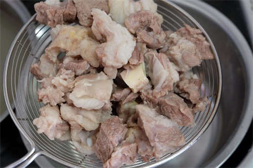 3、再把羊肉冲洗干净,切成小块;把切好的羊肉块放入热水里面,焯烫一会儿,捞出来,沥干水,备用;