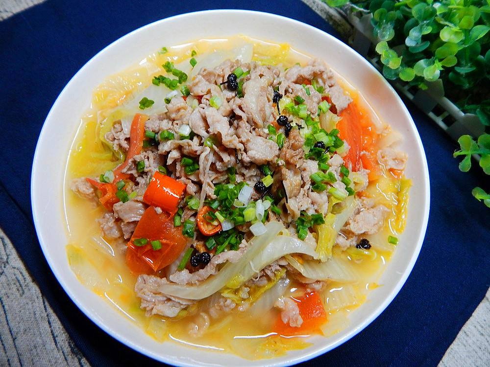 6、再下入切好的白菜,继续煮炖一会儿,倒入适量的盐、料酒和胡椒粉,进行调味,最后撒一些葱花,即可;