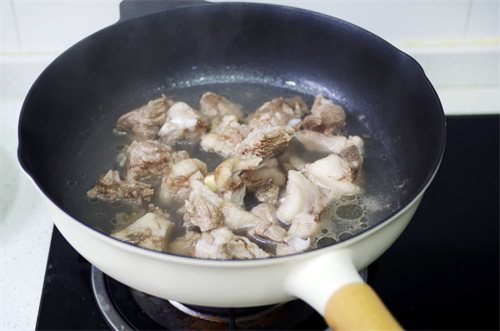 4、现在就可以热锅烧油了,等到油热之后,放入葱花和姜丝爆香一下,倒入焯好的羊肉块,进行翻炒;