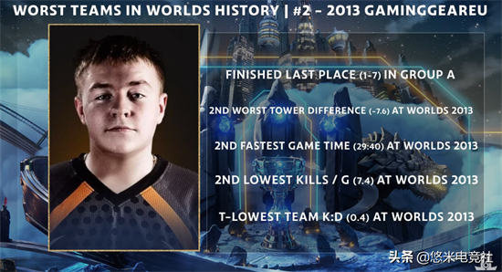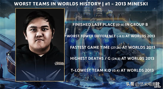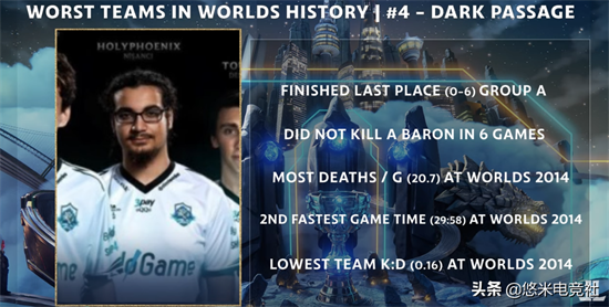 这是来自外卡TCL赛区的队伍。虽然在赛前他们也都不被看好,但是没想到竟然与其他战队的差距如此巨大。在A组他们全败垫底,场均死亡高达20.7,是当时最高;场均时长为29:58,是当时第二快;击杀阵亡比为0.16,倒数第一。这样的数据几乎是和其他参赛队伍相差不止一个档次,堪称史上最弱的外卡战队了。