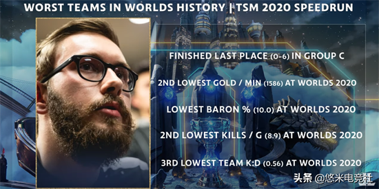 第一个上榜的就是去年世界赛上的TSM。作为LCS赛区的一号种子,他们小组赛未尝一胜,以0-6的战绩全败收官。这是S赛有史以来第一个0-6淘汰的一号种子,被视为LCS之耻。而且从数据上来看,TSM在S10中的分均经济(1586)倒数第二、大龙控制率(10%)倒数第一、场均击杀(8.9)倒数第二、击杀阵亡比(0.56)倒数第三,各项数据都接近垫底。