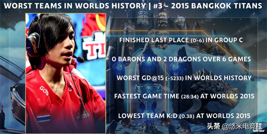 第三名同样是来自外卡赛区。当时被分在C组的曼谷巨人,以0-6的战绩草草收官。在这六场比赛中,他们没有拿到任何一条大龙,仅仅拿到两条小龙。15分钟落后经济高达5233,场均时长也是当时最快(28:34),同样与其他战队的实力差距悬殊。