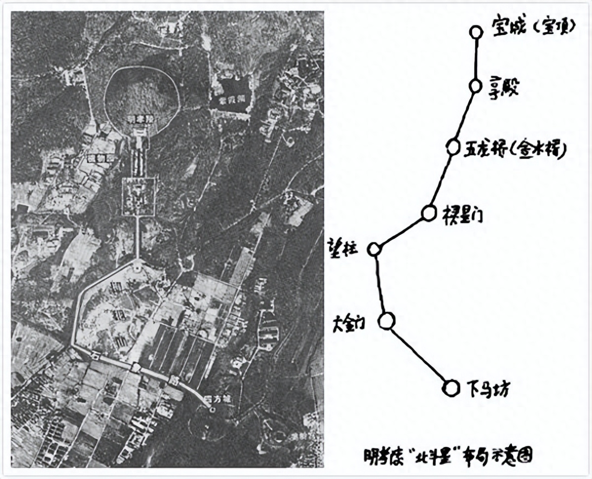 此外,有学者指出明孝陵陵区的主要建筑从下马坊起,经大金门,望柱、棂星门、金水桥、享殿至宝城,连起来是一个北斗七星的形状,此说略微勉强,但也不能完全否定。因为朱元璋生前确实很在意天象,皇城也取名为“紫禁城”,“紫”便是代表紫微星,意指“天帝”所居。1956年,当定陵地宫内万历帝后的棺木被打开时,万历帝后入葬的姿势也是很奇怪的,有人分析是“北斗七星式”,或许这是有明一代天子的传统。