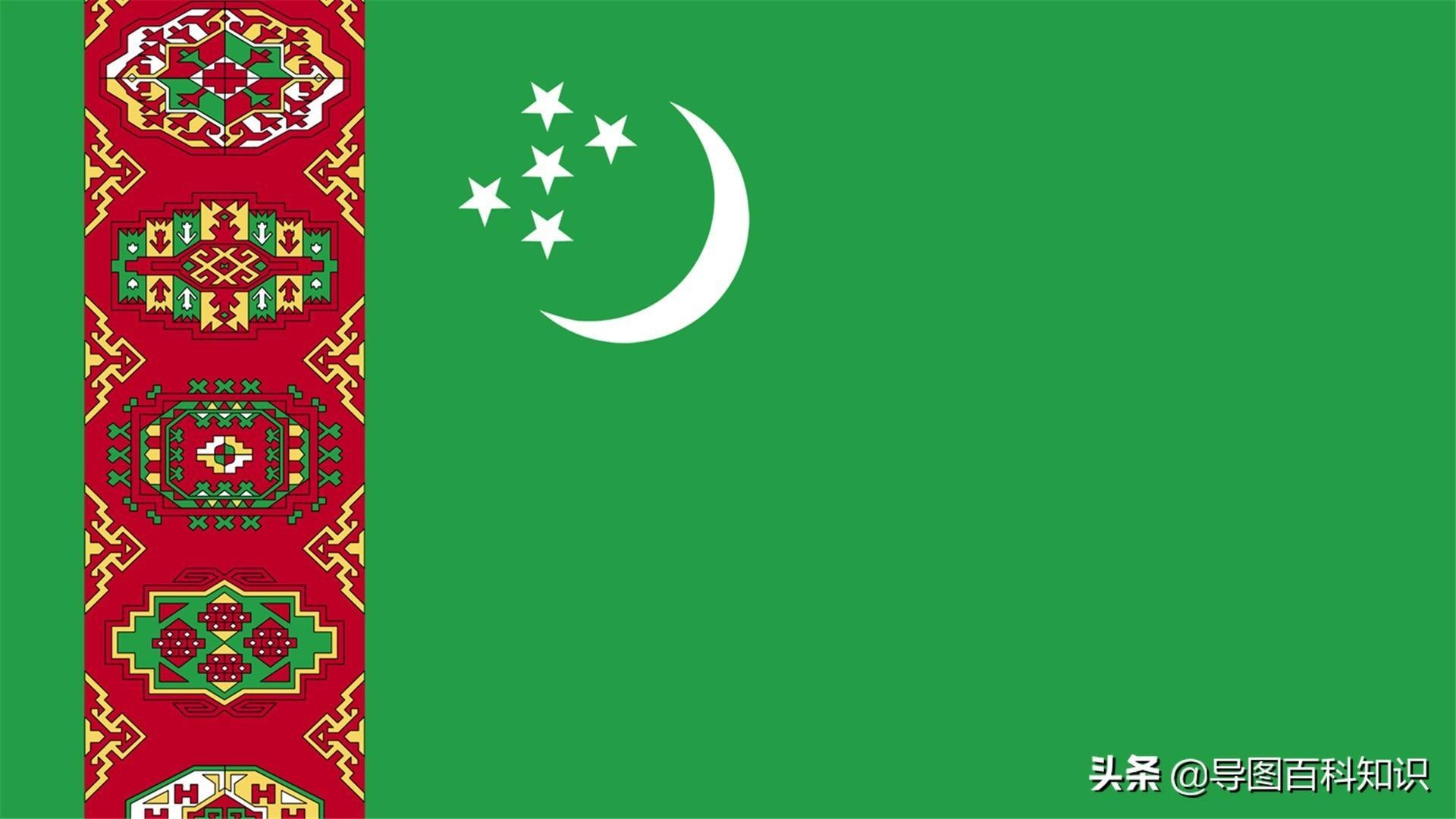 国旗:长方形,长宽之比为5:3。绿色旗面,靠近旗杆处自上而下排列着五种地毯图案及橄榄枝,上中部有一弯白色新月和五颗白星。绿色是该国传统颜色。五种地毯的图案,代表五个土库曼人祖先的部落以及他们的互相团结、友好。橄榄枝象征和平与中立。新月象征平安如意。五颗星代表该国的五个省。