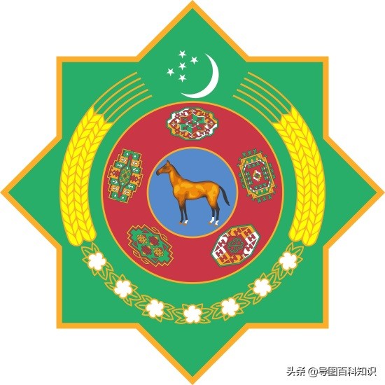 国徽:圆形,由三个同心圆组成。绿色大同心圆顶部为新月和星,两侧为麦穗,下部是七颗棉花花朵;中间红色同心圆上绘有五种地毯图案;小蓝色同心圆上为著名的阿哈尔捷金马。