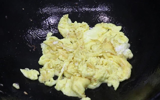 第三步:锅烧热加入一点油,倒入鸡蛋液并快速搅散,炒至鸡蛋液完全定型,然后用勺子搅成大块。