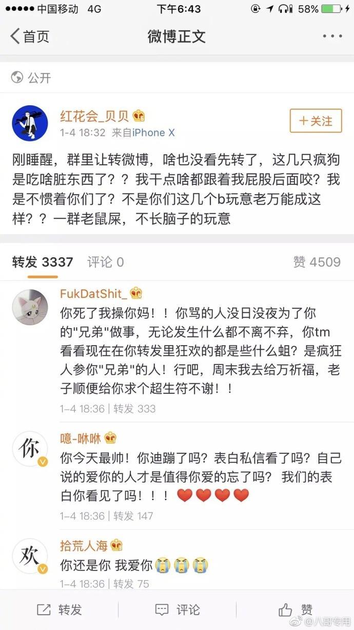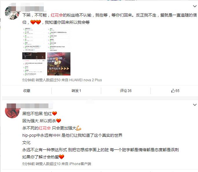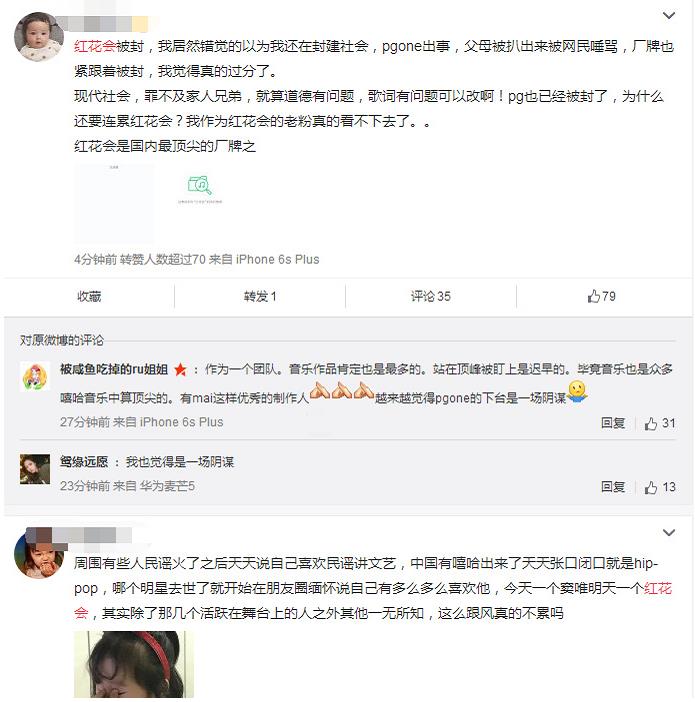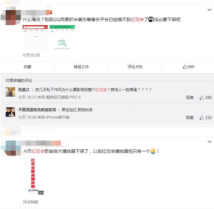 而对于花红会的音乐下架很多粉丝不满开始在微博上闹腾,大骂“绝不认输,会等他们回来,爱就是一直追随的信仰”、“红花会被封,我居然还有种错觉生活在封建社会,PGONE出事,父母都被拖出来骂,我觉得过分了,罪不及家人兄弟,作为红花会的老粉都看不下去了”!