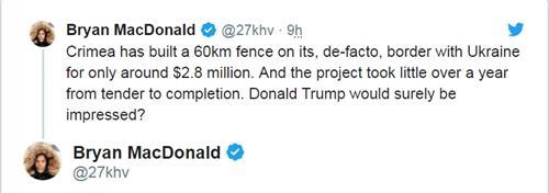 推特网友Bryan MacDonald:克里米亚在与乌克兰之间60公里长的边境屏障仅花了约280万美元,该项目从投标到竣工用了一年多一点的时间。唐纳德·特朗普肯定会对此印象深刻吧?
