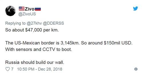 推特网友Zivo:所以是大约每公里4.7万美元。美墨边境长达3145公里。所以大概是1.5亿美元,还带传感器和闭路电视。应该让俄罗斯来建我们的墙。