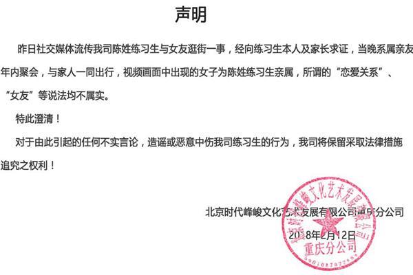 “211事件”出来的第二天,tf家族的官博就发表公开声明,称该女生是陈玺达的女亲戚,并不是女朋友。公司这段声明也非常机智:一是没说出陈姓练习生全名叫什么,有效预防二次造谣。二是“女亲戚”合情合理,毕竟在大多数人眼中,异性亲戚牵手,在孩子长大了之后,确实不太合适。