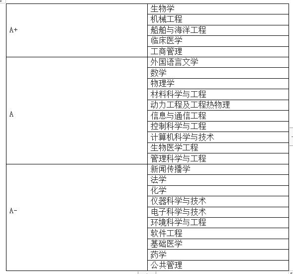 上海交通大学共有49个一级学科入榜。其中,共有5个一级学科评估结果为A+(前2%或前2名),A类学科数共有25个(前10%),A类学科数量位居全国高校前列。5个A+类学科分别是,生物学,机械工程,船舶海洋与工程,临床医学,工商管理。A类学科则全面覆盖文、理、工、商、医等学科类型。