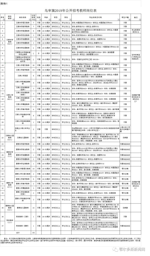 为解决教师紧缺问题,进一步优化教师队伍结构,加快乌审旗教育体育事业发展,2019年拟面向社会公开招考教师191名,其中中小学、幼儿园教师189名,党校教师2名,特发布此公告。