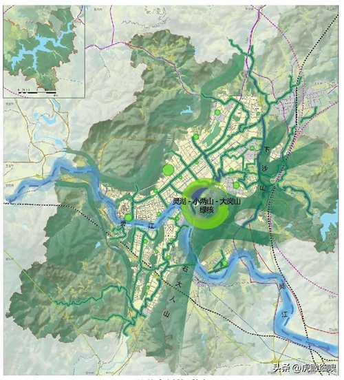 蓝绿纵横:结合主要山体和水系,形成城市与自然互动的蓝绿网络,发挥生态效益、提高人居环境品质。