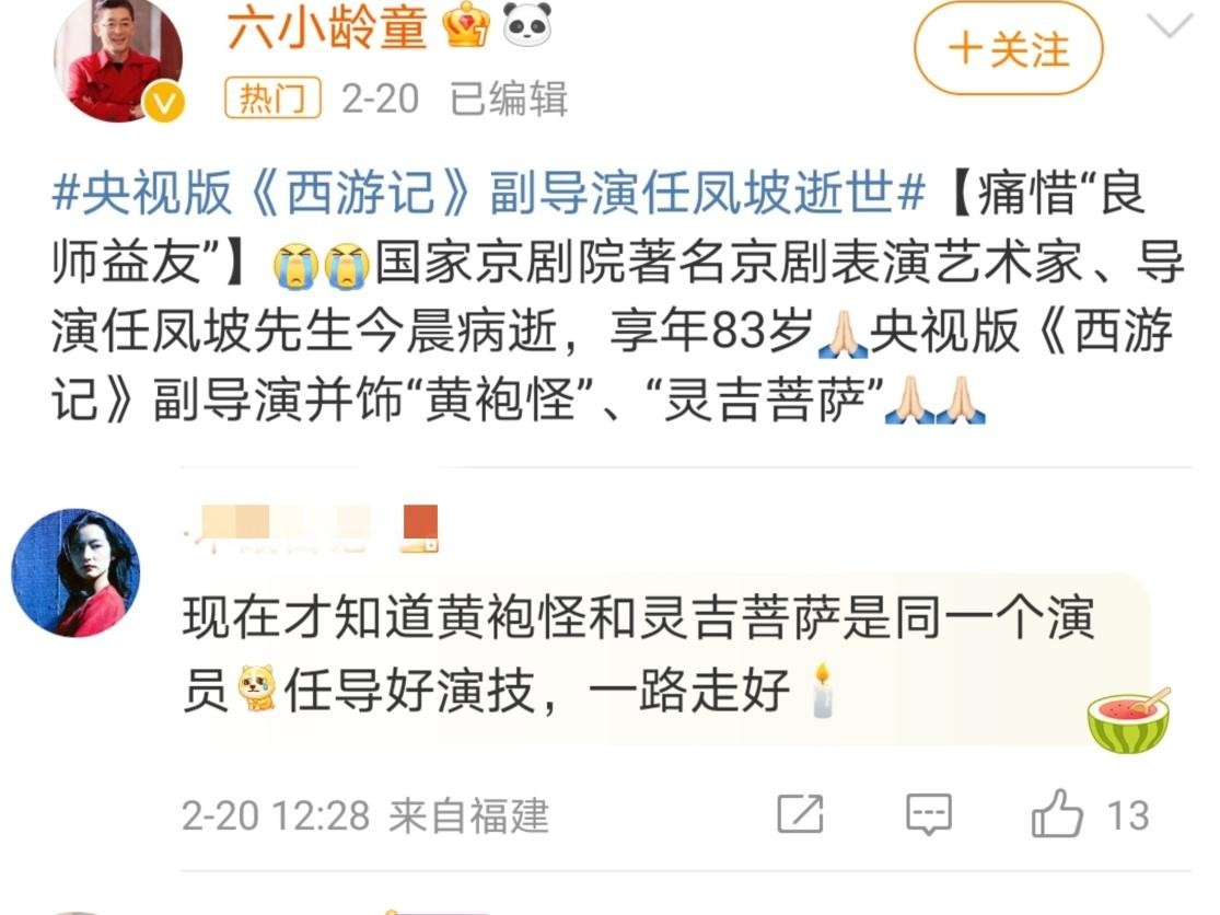 孙悟空扮演者六小龄童,在平台哀悼良师,网友们也纷纷留言:“老先生一路走好。”