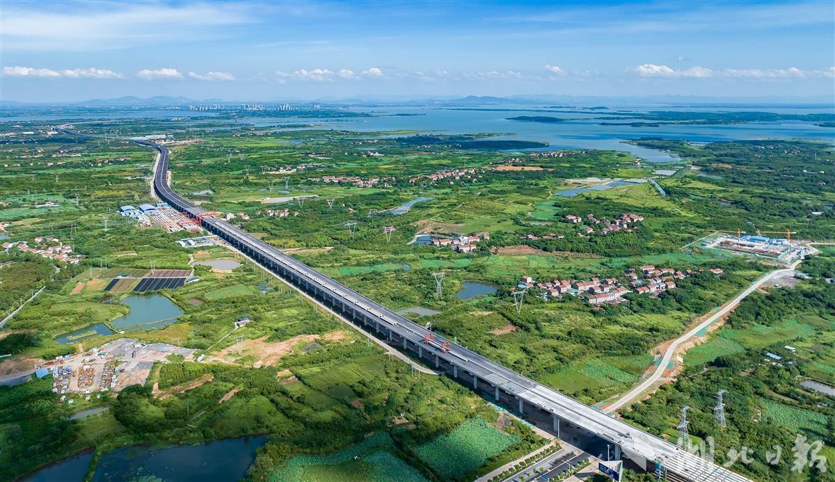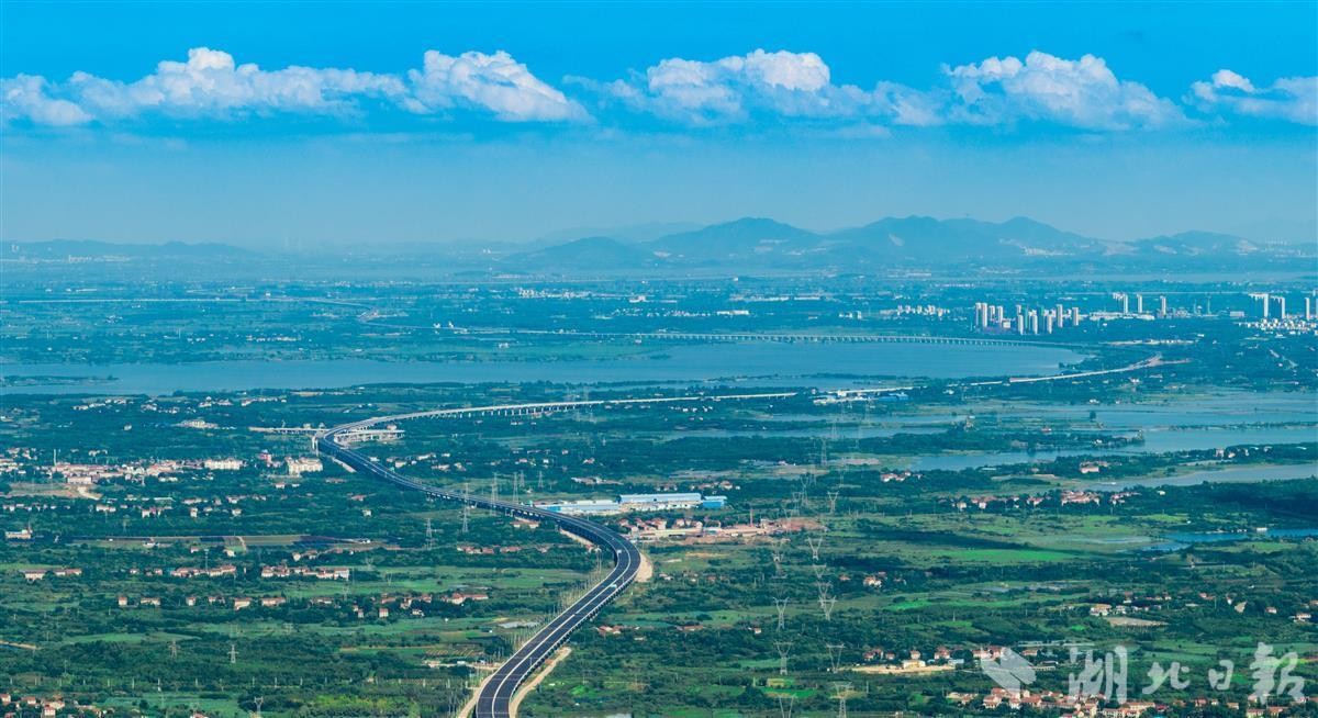 7月22日,航拍武阳(武汉至阳新)高速武汉段。武阳高速公路起于武汉东湖高新技术开发区凤凰山互通,沿凤莲大道跨梧桐湖后进入鄂州境界,止于武汉至阳新高速公路黄石段。路线主线长约34.6公里,其中武汉段16.7公里,鄂州段17.9公里。全线采用双向六车道高速公路标准,高架桥占比95%,设计速度100公里/小时。