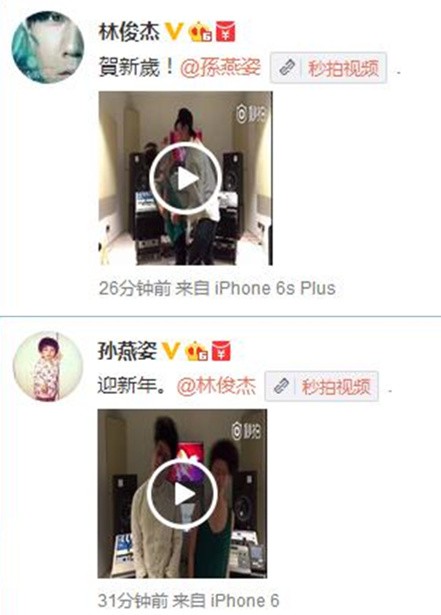 今日晚上,林俊杰孙燕姿两人一前一后发微博,内容都是一个4秒钟的视频,配文都是庆祝新年。
