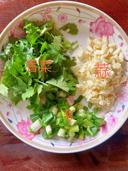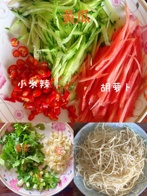 [二]做法:先把黄瓜、胡萝卜切丝,小米辣、葱和香菜切断,蒜切末