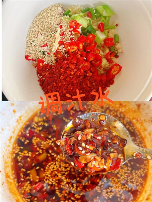 [三]调拌面的汁水:把小米辣、葱、蒜末和辣椒面放碗里,锅中烧热油倒入碗里,然后搅拌(以免烫焦),接着放生抽、醋、白糖、芝麻一起搅拌