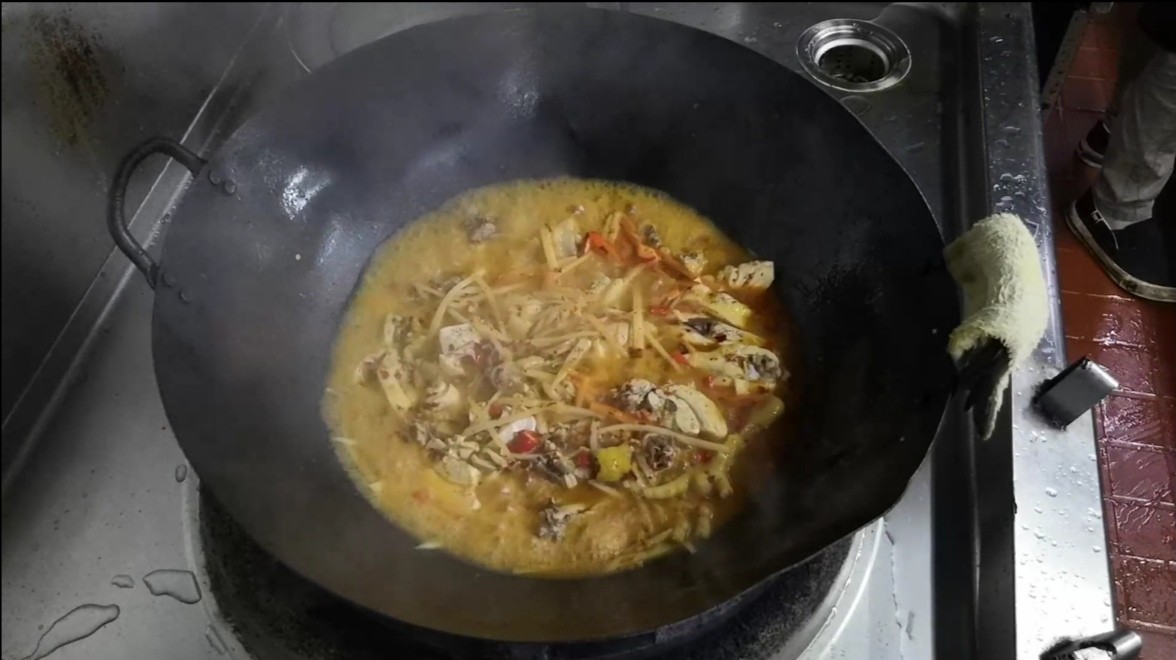 4. 一切准备就绪后我们开火制作,锅里放油,先将仔姜丝、小米椒、花椒,小火炒出香味,再放辣椒灰进来炒出红油,然后放盐,放盐需要比平常做菜时要多放,因为等下会放到白醋(白醋淡化盐的咸味),再就是关键的放醋,有自酿的米醋效果最好,条件不允许的情况下我们只好用白醋代替。煮一只鸡用到的白醋大约是1/3瓶(167ml)毫升。配料全都炒出酸、香、麻、辣味后放入剁好的鸡块,然后放入两勺煮鸡时的鸡汤,大火煮4分钟。