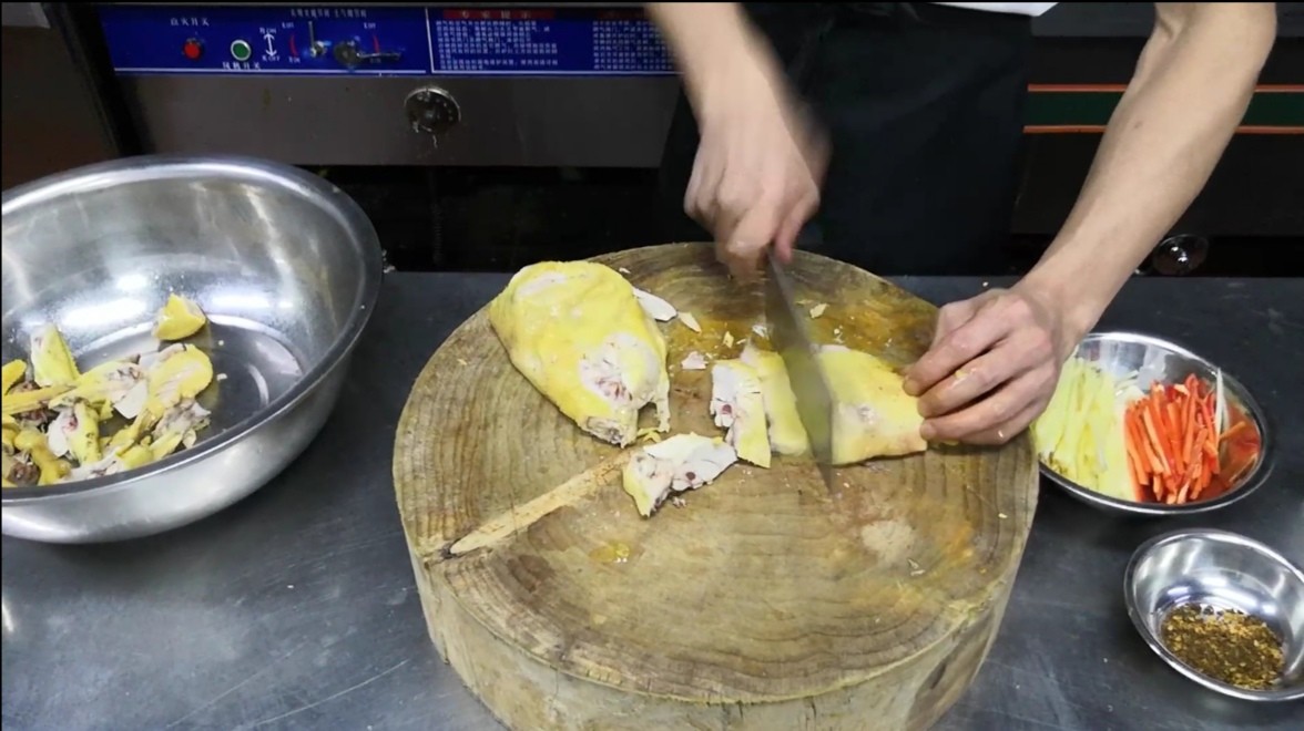 3. 鸡浸泡8分钟左右捞出,让其自然冷却再斩成一指半大小的块。