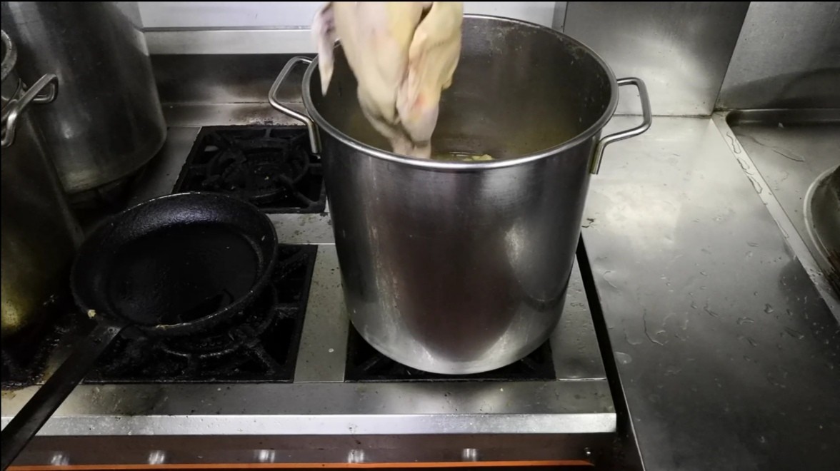 2. 东安鸡的制作是由煮鸡开始,先给鸡的内脏全部掏净,在鸡腿连接鸡爪的关节处划一刀(不划断),放入加了黄姜的汤桶中大火烧开,然后关火浸泡8分钟左右。