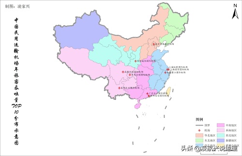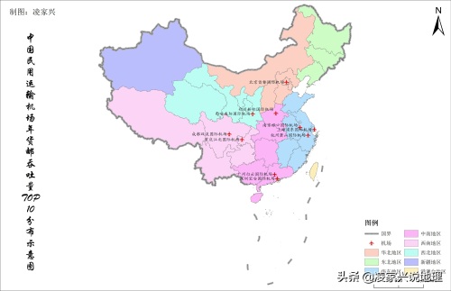 中国民用运输机场年货邮吞吐量TOP10名单空间分布示意图